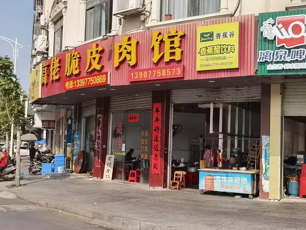 原来,玉林吃狗肉的店是这样的,店名没有狗字,都叫脆皮肉馆,玉林有两家最出名的狗肉店,位于南流江新民桥头,一家叫“高佬脆皮肉馆”(老字号),一家叫“玉林宁大姐第一家脆皮肉馆”,狗肉价:40元/斤,店面很简陋,没有想象的豪华。