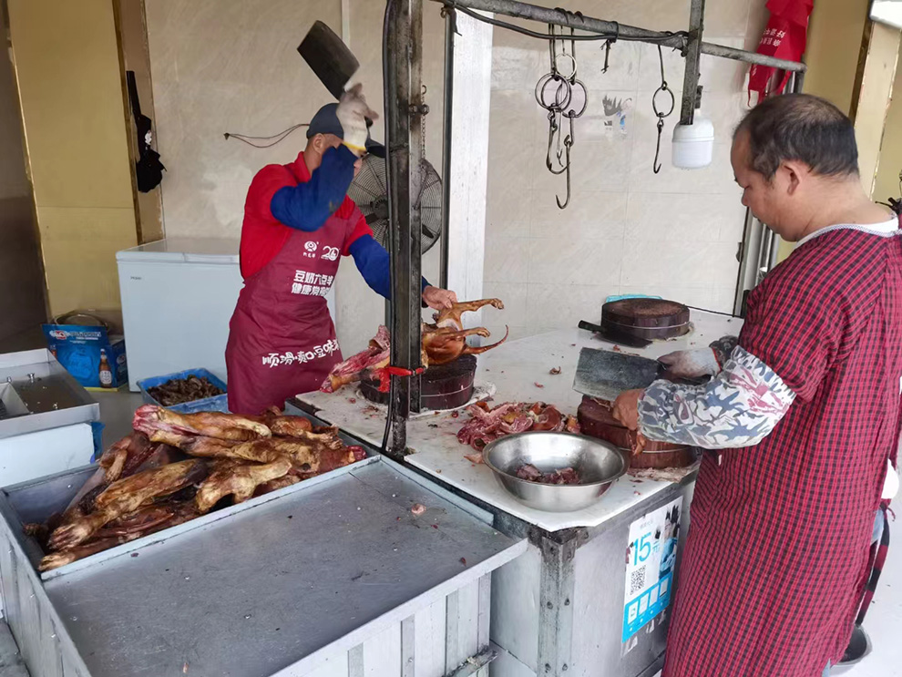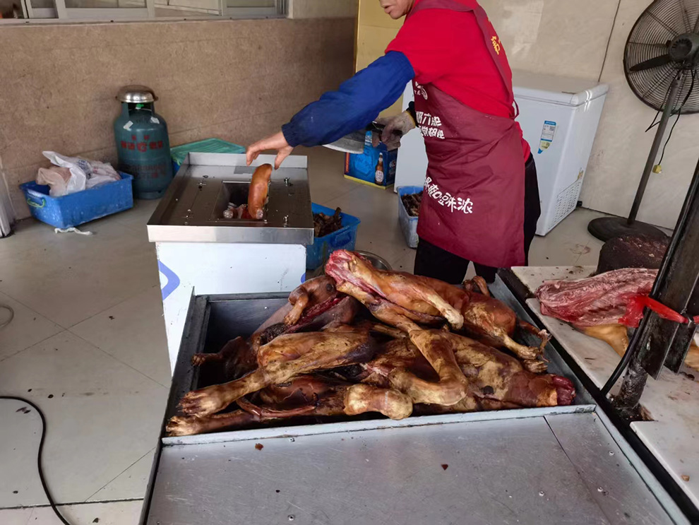 但该馆切狗肉的效率还是很高的,主要是旁边的一台切狗机帮了大忙,先由人工将狗一分为二,然后放入切狗机就变成排骨形状,最后再人工横切数刀,就和食客的口型对上了,大点小点都行。